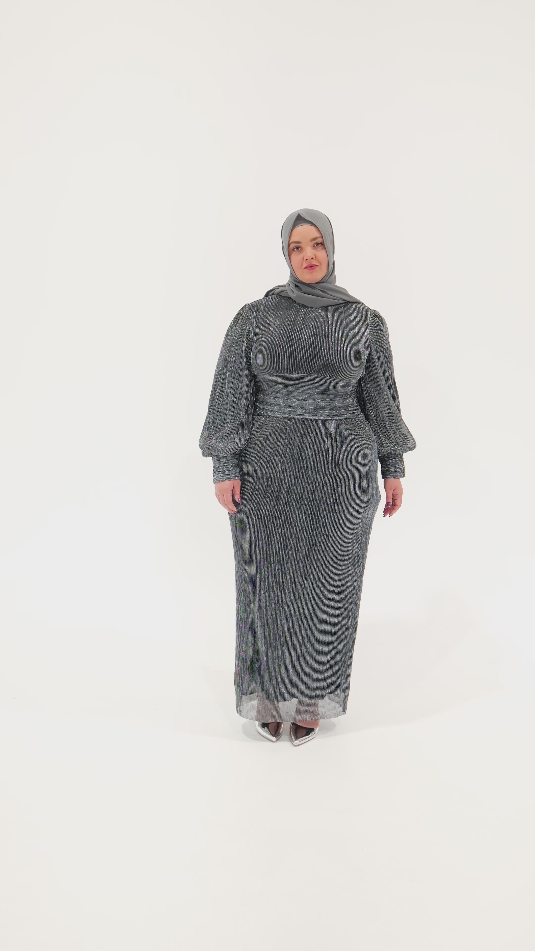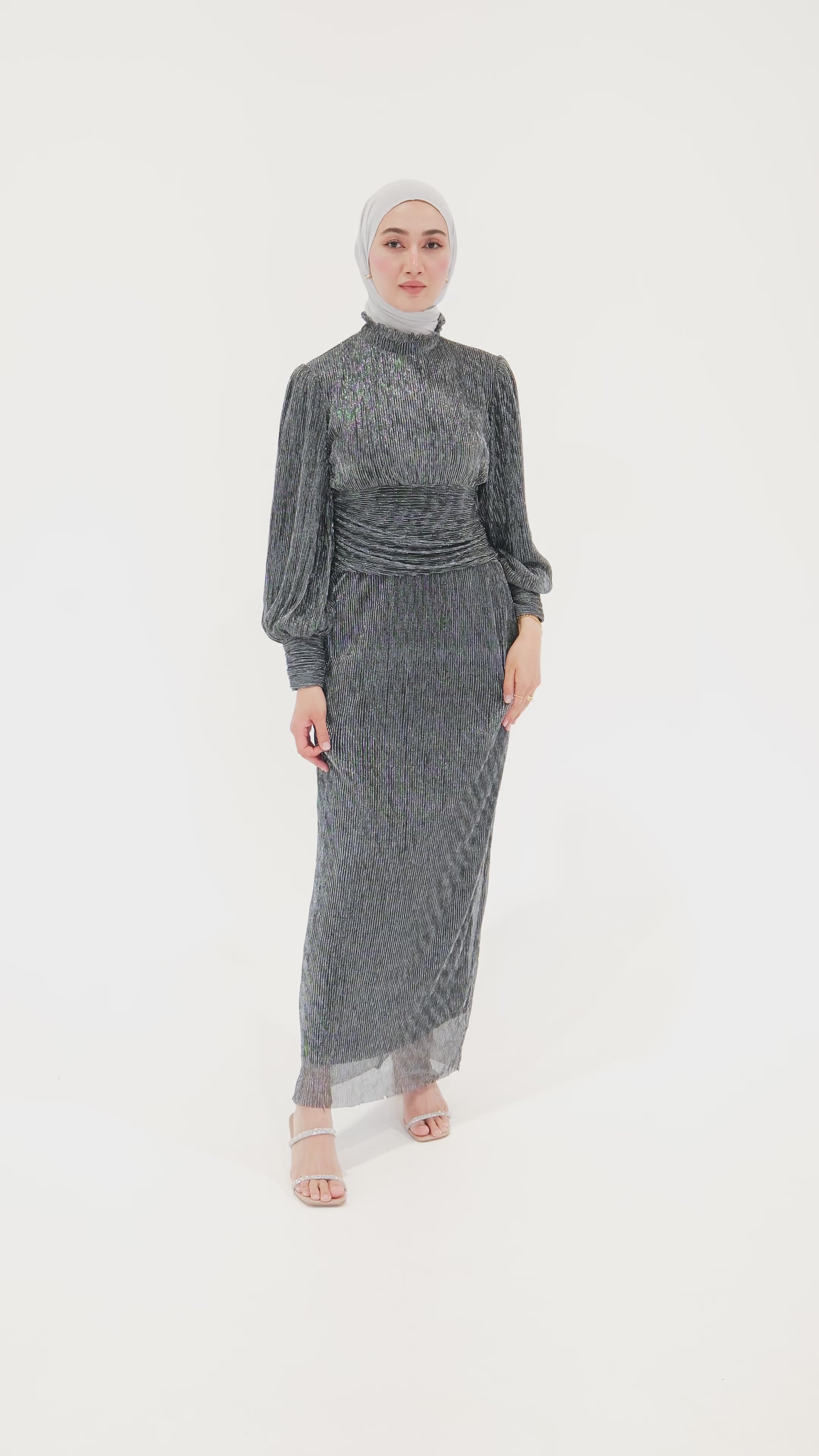 What distinguishes this design is the enchanting metallic effect that's certain to make a statement, perfect for every event. In response to high demand and its soaring popularity, we are delighted to unveil the Sabrine Dress in a captivating Silver metallic color, making it the ideal choice for special occasions and Islamic fashion.